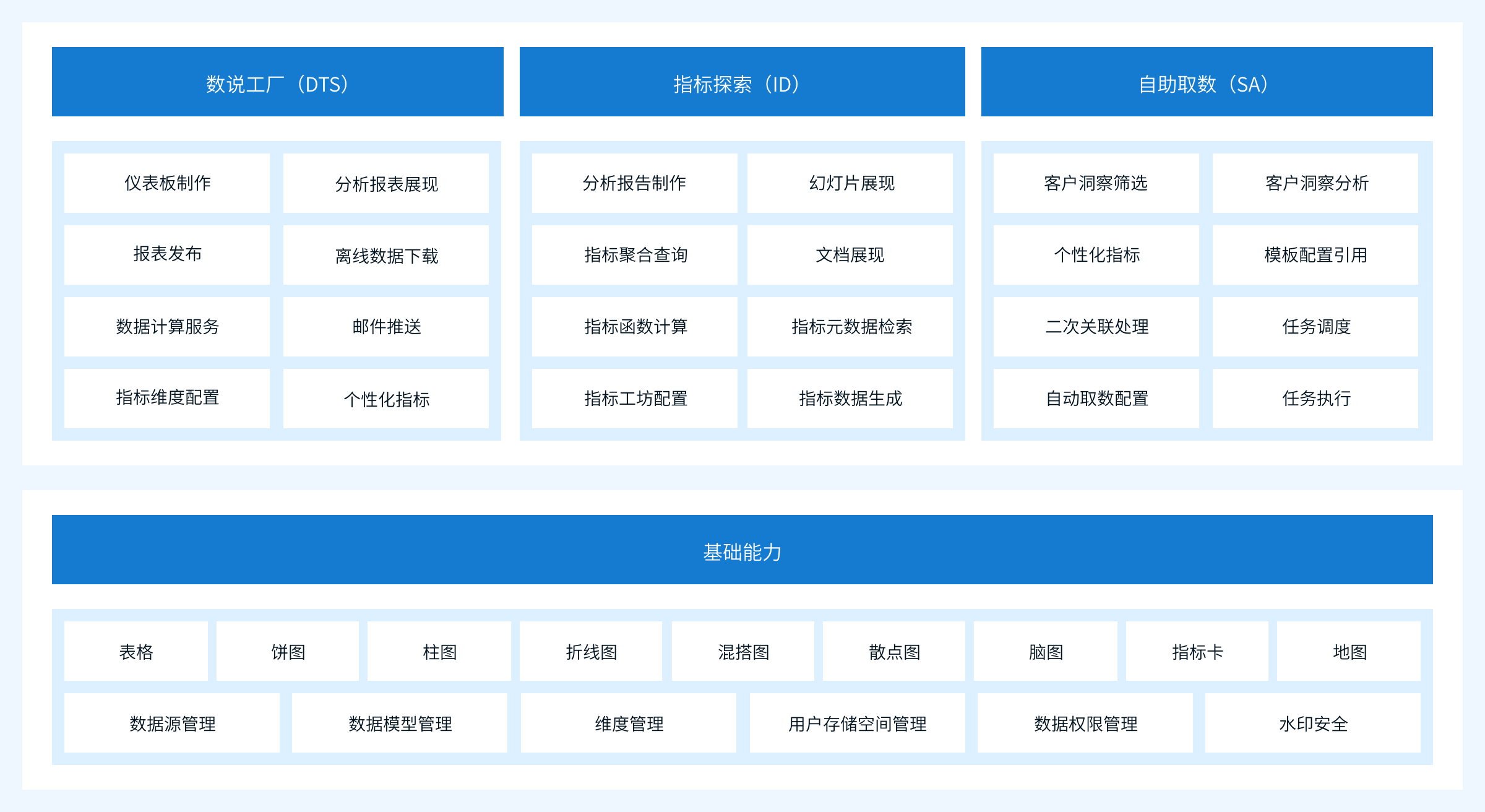既能支撑业务分析师完成日常数据分析工作,又能支撑一线业务人员完成日常报表和取数,也能支撑开发工程师进行二次开发和需求定制。