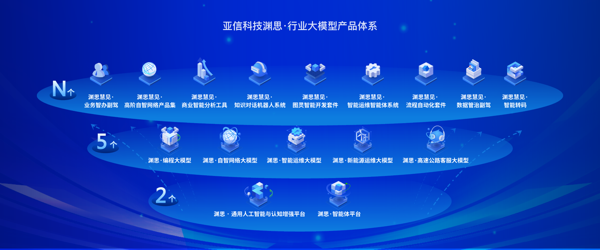 渊思·行业大模型是亚信科技面向千行百业,聚焦“平台、模型、工具”三个层面建立的通用人工智能与行业认知增强一体化的行业大模型产品体系。该产品体系包括两个平台,五个行业专属大模型,N个适配特定应用场景的认知增强工具。覆盖从大模型研发到应用落地生命周期全流程,助力企业高效完成一站式智能转型。