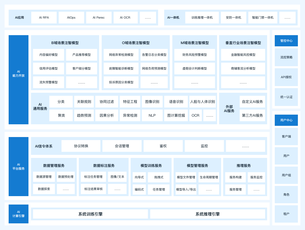 AISWare AI²是一个用来构建大规模智能服务的基础设施,是企业智慧中台的中枢,可以为企业智能化转型提供算法模型的分步构建和全生命周期管理服务,可以帮助企业将自己的业务不断下沉为一个个算法模型,以达到复用、组合创新、规模化构建智能服务的目的。