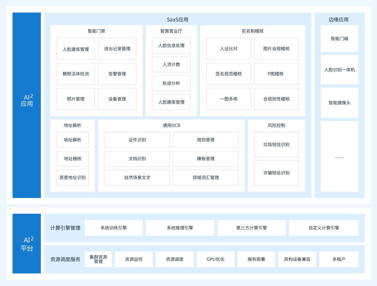 AISWare AI Cube(AI 魔方)智能应用是一套采用亚信科技人工智能平台的成熟算法和模型,结合实际应用场景具备端到端实现的智能应用产品,包括智能门禁、智慧营业厅、实名制稽核、通用OCR、地址解析、风险控制等SaaS应用,以及人脸识别一体机、智能摄像头、智能门磁等边缘应用。这些场景可应用于安防、稽核、风控、防疫等众多领域,帮助企业快速应用智能能力,实现降本增效。AI应用具备人脸识别、目标检测、图像分类、OCR等丰富的AI能力,可以快速与现有系统集成,为现有系统注智,并具备多租户隔离管理能力,多个系统之间使用互不影响。利用AI应用,帮助企业在业务流程中实现自动化,提升生产效率、降低人工成本。