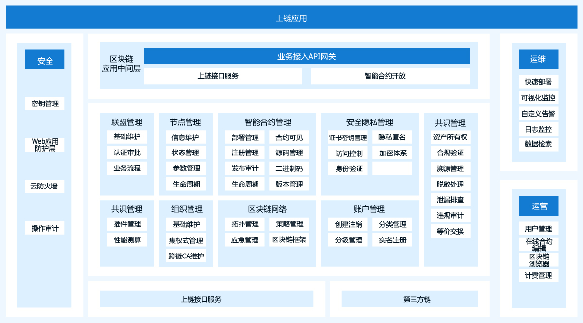 基于区块底层技术提供多种行业领先技术,包括可插拔的高效共识算法、基于用户口令和可信CA的双重权限、同构或异构区块链的跨链协作、高可用存储、多类型账本以及插件式包含国密的加密算法等。