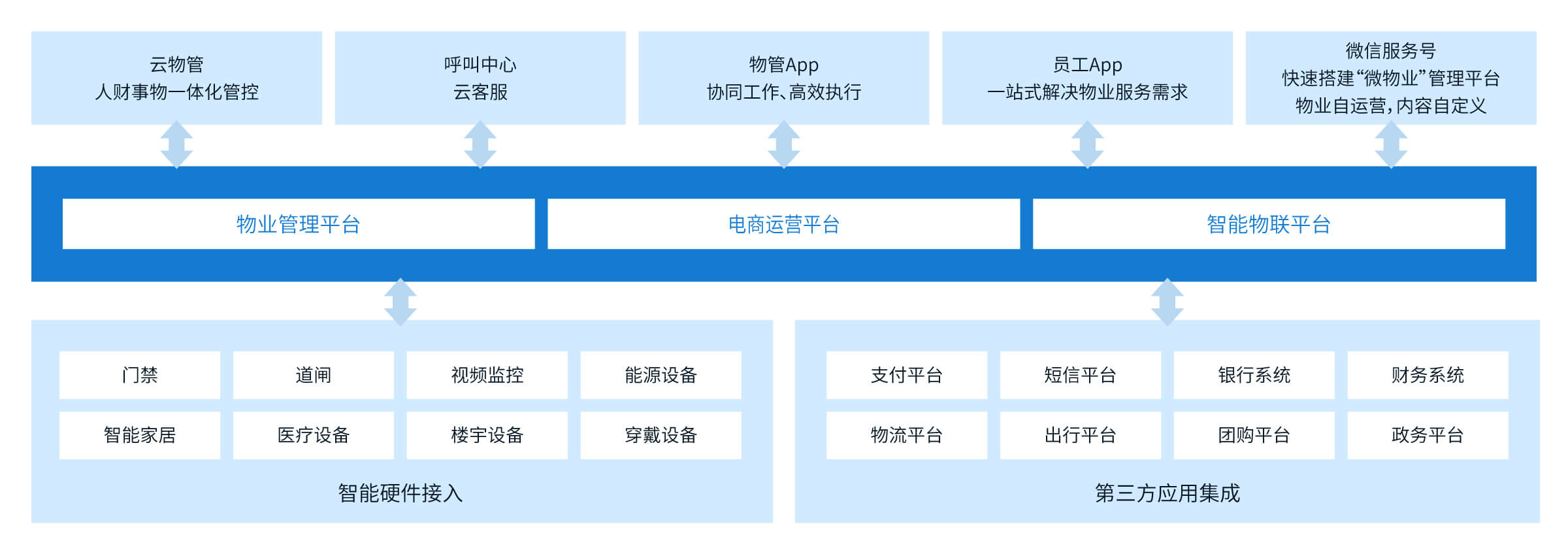 通过接入电商、政务、园区物业、企业、商家等业务提供或消费需求,打造园区物业管理平台、园区电商运营平台、园区智能物联平台、物管App、员工App“三平台两手机端”解决方案,为物业企业提供SaaS服务模式的管控一体化、服务标准化、运营精细化的高效、安全的物业管理平台。