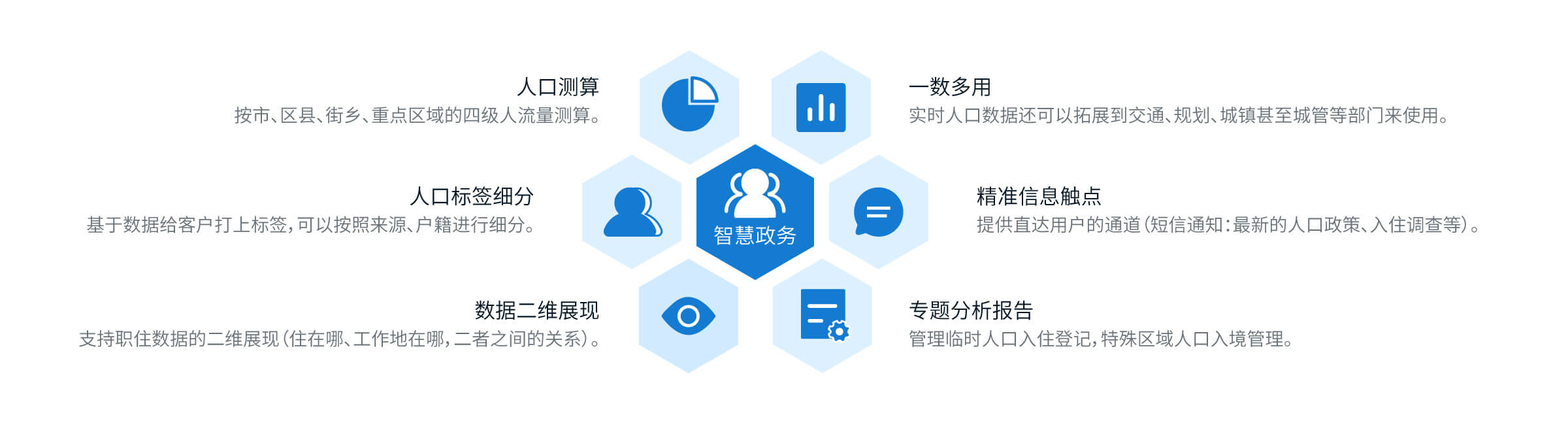 通过IT&DT结合,基于位置数据进行深度挖掘分析,满足对实时人员位置和流动性情况进行分析和管理的各种公共管理需求,可向公共管理部门提供人口热力图、客流监控分析、客群分析、人群偏好分析等功能。