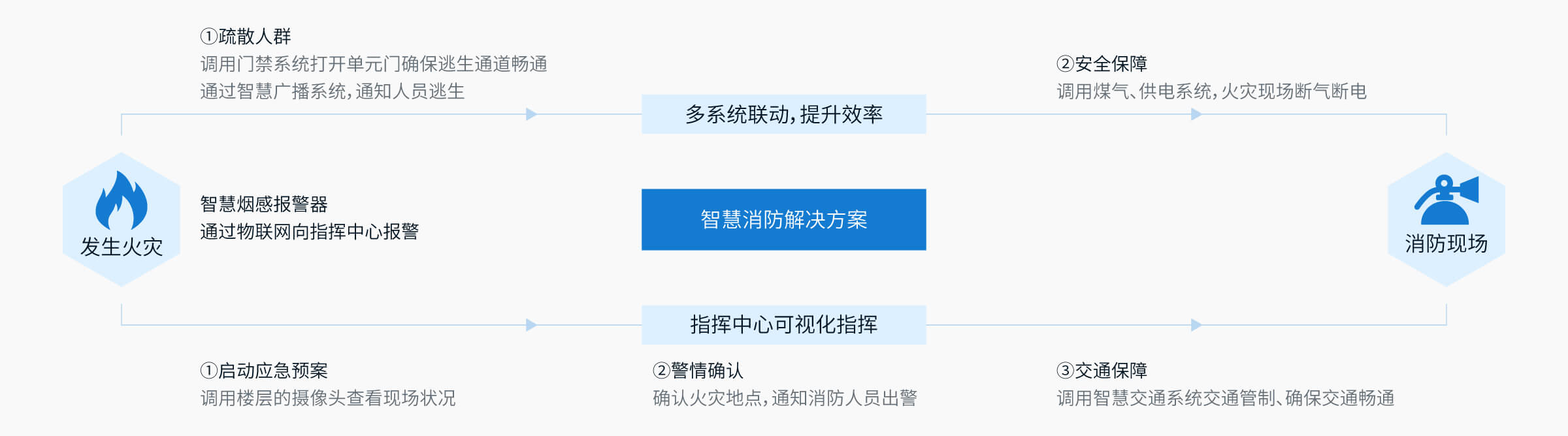 与预警、人口管理、安防巡更、用水等系统互联互通,实现场景中的子系统联动消防。