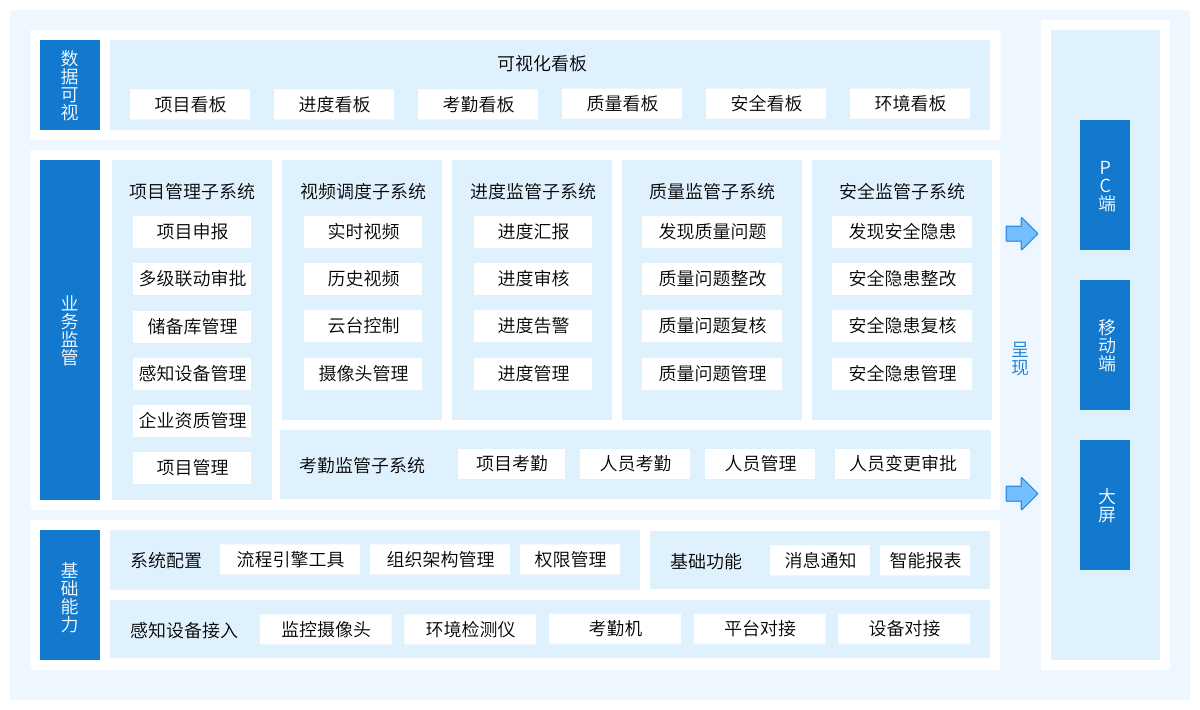 面向各地重点工程监管部门,以视频调度为核心,提供“ 一套标准、 一个平台、 多个系统”,打造以重点工程为主体的多方协同、多级联动、管理预控、整合高效的智慧化监管服务平台,实现对辖区重点工程的施工进度、投资进度、质量安全等内容的监管。