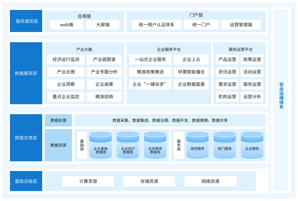 针对“服务型”政府的需求,构建企业级服务资源及运营工具矩阵,搭建企业与政府的统一沟通桥梁,以运营的方式服务于企业,提供一站式政务服务平台;同时依托大数据能力将企业数据及政务数据进行深度融合并充分挖掘,结合业务场景输出丰富产品能力,辅助管理部门进行科学精准施策。